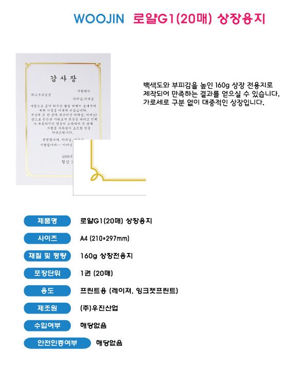 상품명 : 우진 G1 로얄 상장용지 A4 160g 20매/pac